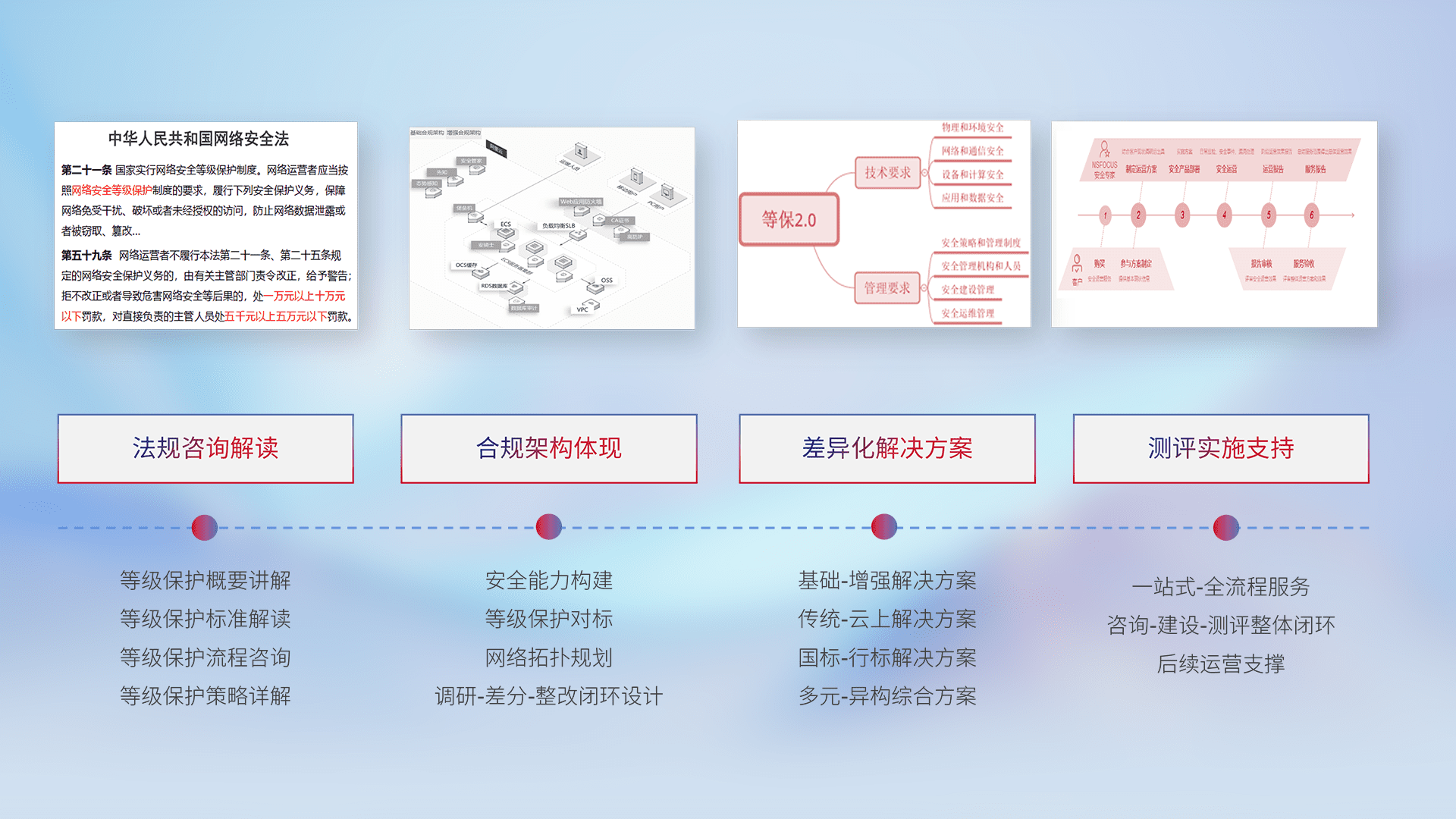 通过专业的法律咨询解读、、、合规架构体现、、、差异化解决方案、、、测试实施支持等服务,,,,为客户量身打造等保合规体系。。